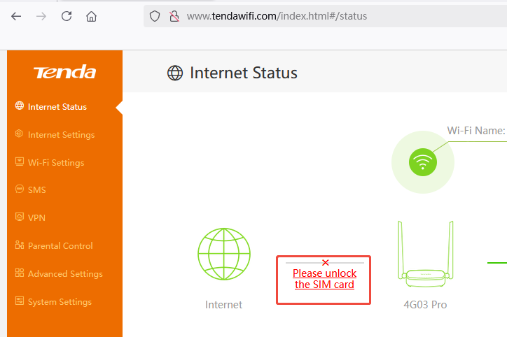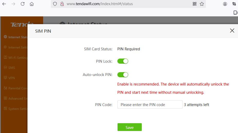 - You can click the prompt message “Please unlock the SIM card” to enter your SIM card PIN code to unlock the device. You only have 3 attempts. If you are not sure, please contact your ISP to get your SIM card’s PIN code and fill in the blank to unlock the card and access the Internet.