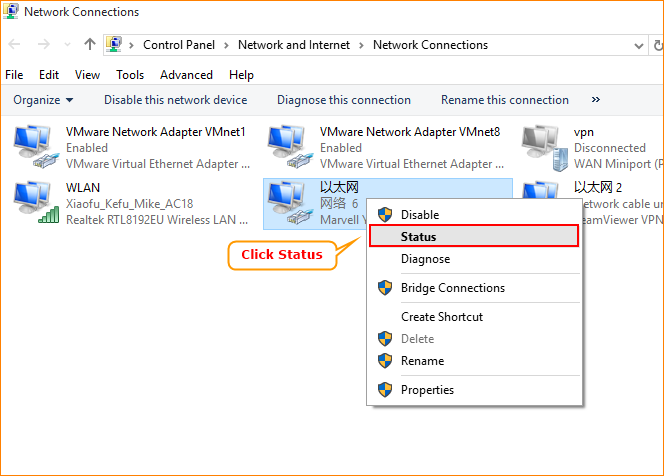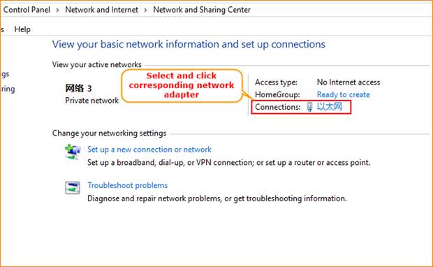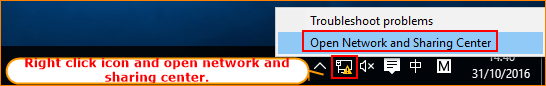 1.1 Right click icon in the lower right corner of the desktop computer, and select “Open Network and Sharing Center”.
