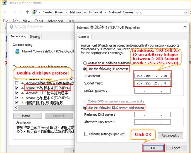 1.4 Double click “Internet protocol IPV4” And select “Use the following IP address”, “192.168.2.X” (X is an integer between 3~253),Subnet mask is “255.255.255.0”.