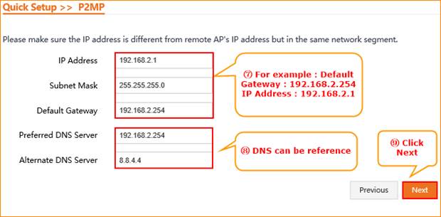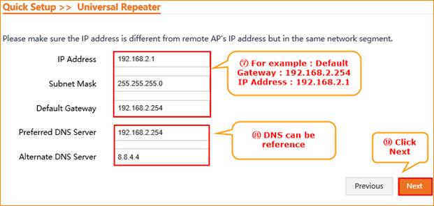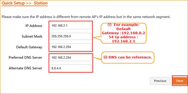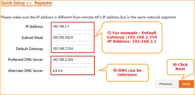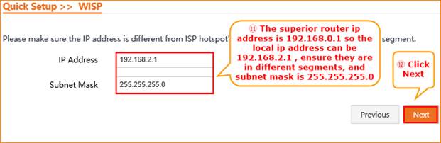 Configure local IP address, confirm it is not in the same network segment with the superior router and click next.
