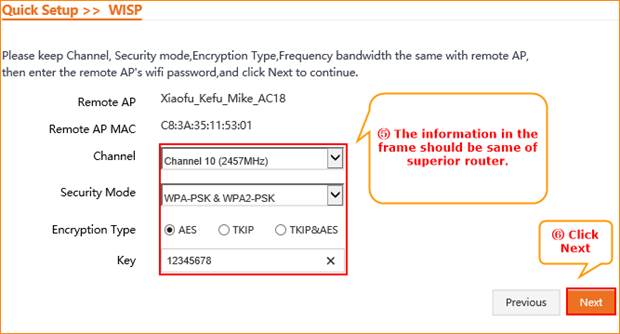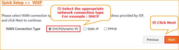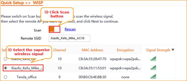 ④Mode four:WISP:Wirelessly connect to ISP station/hotspot to share Internet to local wireless and wired network.
