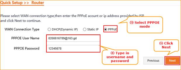 Select appropriate Wan Connection Type, for example PPPOE and fill in username and password. And click next.