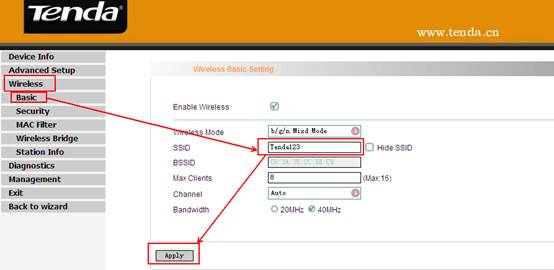 1、click on wireless –>basic on the left menu ,please change SSID (it is your wireless network name)for other name, and then held on Apply