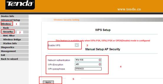 2、click on wireless –>security on the left menu ,please disable WPS setting ,select Network Authentication to WPA-PAK or WPA2-PSK,change WPA Encryption to AES, and then WPA passphrase ( please type in at least 8 numbers or letters).
