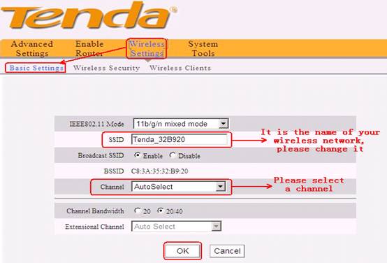 4. In the homepage of 3G150B, please click Wireless Settings in this new page, please change the SSID (SSID is the name of your wireless network) and select Channel 1 or Channel 6 or Channel 11 as Channel. Then click OK to save the Settings.