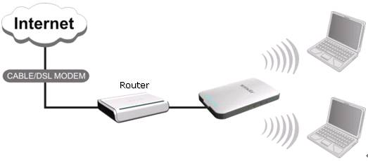 6. The configuration for the AP mode of 3G150B is done. You can unplug the Ethernet cable between your computer and 3G150B, then connect 3G150B to uplink ADSL Router Modem as the picture shows: