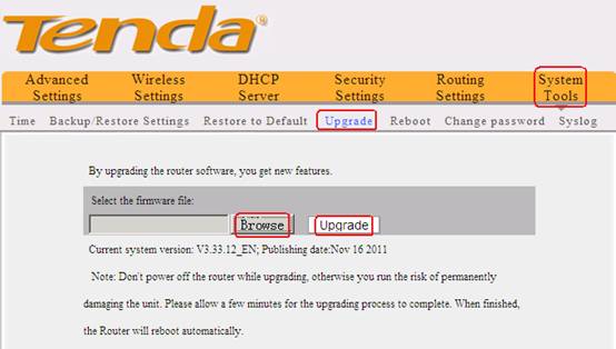 4.Click System Tools->Upgrade, then click Browse to Locate and select the firmware, then click Upgrade button to upgrade the firmware for the router. The router will reboot after finish upgrading.