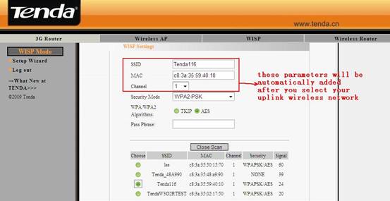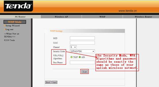 3.Please input the same security settings of your uplink wireless network, including Security Mode, WPA Algorithms and Password. And click Scan to search your wireless network.