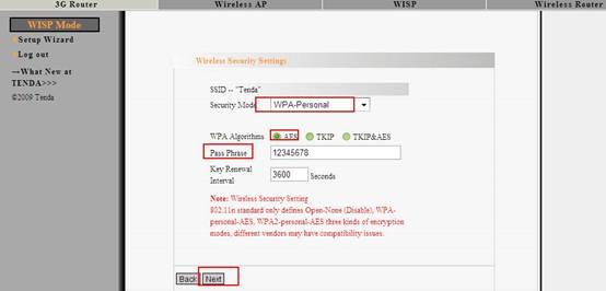 8.Then you are in the Wireless Security Settings page where you can set a password for your network. Please select WPA-Personal as the security mode and AES as the WPA Algorithms, then input at least 8 characters, numbers of letters, in the Pass Phrase. Click Next.