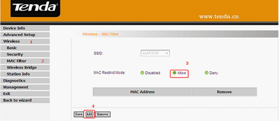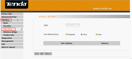 4. Click Wireless à MAC Filter in the gray menu on the left. Then the page will display as below: