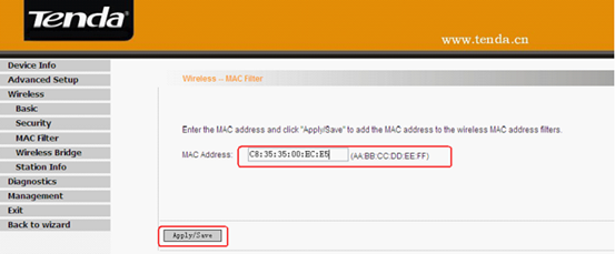 2. Enter the MAC address C8-3A-35-00-EC-E5 in the text box like the picture as below. Click Apply/Save to save your settings.