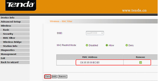 To delete an added MAC address, first check the Remove box behind the MAC address in list and then click the Remove button.
