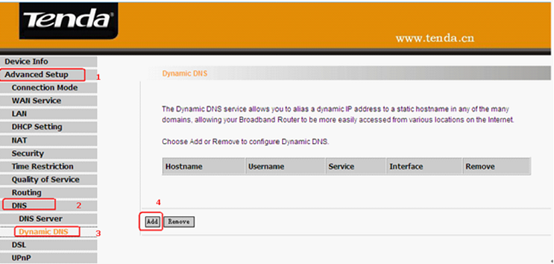 4. Click Advanced Setup->DNS->Dynamic DNS on the left side.