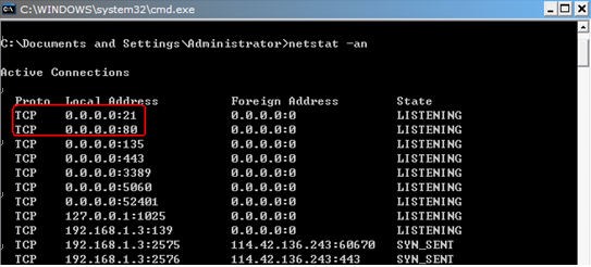 Take FTP Server for example. Click startàrun and type cmd in the blank. In the new window, please type netstat -an. Then you can check whether the FTP server has been run successfully.