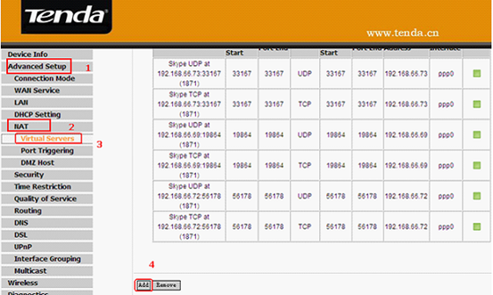 4. Click on Advanced Setup->NAT->Virtual Servers.
