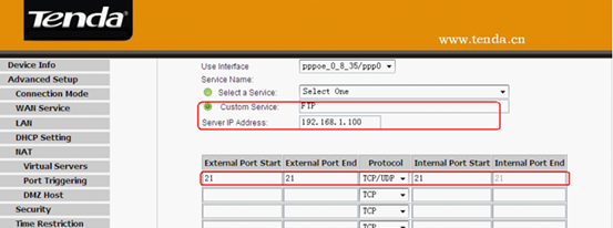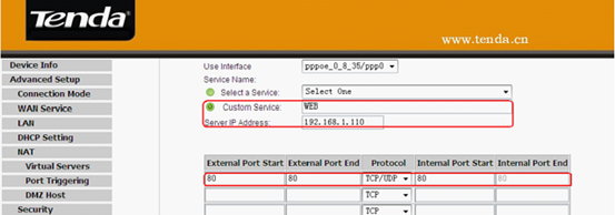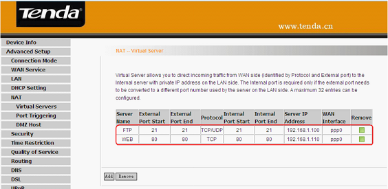 (2) Web server (port: 80) is at the IP address of 192.168.1.110. And you want your others from Internet to access your FTP and Web servers respectively via port: 21 and port: 80.