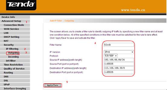 If you want to filter the PC at the IP address of 192.168.66.64/24 and make it unable to access 113.108.109.35/8. Then follow the instructions below:
