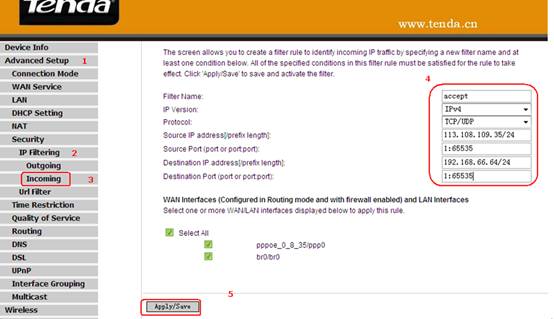 After the settings, all the traffic from the IP Segment 113.108.109.35/24 can be accepted to 192.168.66.64/24.
