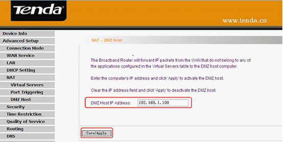 In the blank of DMZ Host IP Address, please type in the IP address of the computer which you want to achieve the communication with Internet without limit.Remember to click on Save/Apply to save the settings.