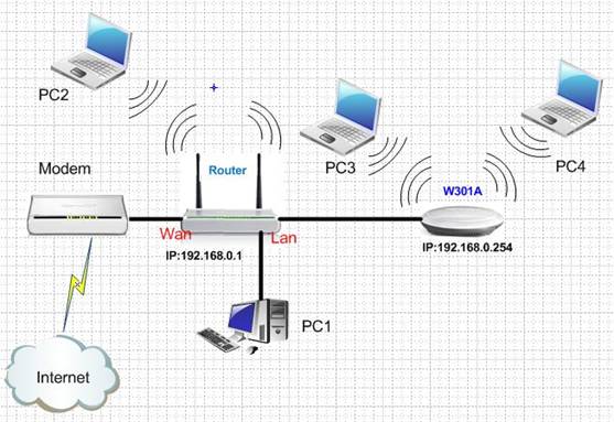 A:Sometimes we have one wired router, and we want to access the Internet wirelessly on laptop, the AP mode of W301A can help you to achieve it.