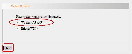 2.After successfully logging, please click Setup Wizard to choose Wireless AP (AP) as the wireless working mode. And click Next.