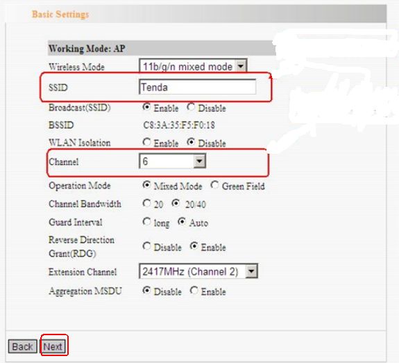 3.In the Basic settings page, change the SSID and select Channel 6 as the channel. And click Next.