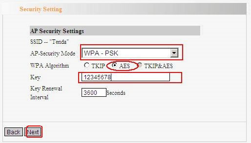 4.In the Security settings page, choose WPA-PSK as Security Mode and select AES as the WPA algorithms, then type a password for wireless network in the blank of Key and click Next.Then click Apply.