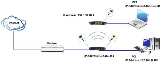 The LAN IP address should be in defferent network segment. For example,if the LAN IP of the uplink router is 192.168.10.1, you can set the secondary router’s LAN IP as 192.168.0.1.