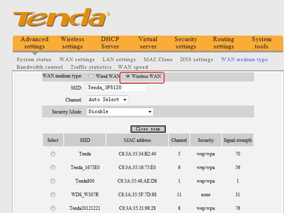 3. Choose Wireless WAN and click Open Scan, you will find the uplink wireless router’s signal.