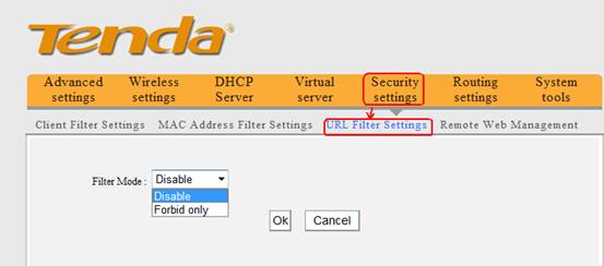 2. Click the Security Settings,then click URL Filter Settings and you will find the page as below. There are two options (Disable, Forbid only). The URL filter is disabled default.
