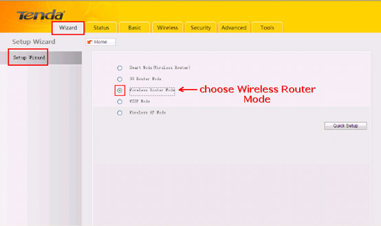 6. After that, you can login to the management page of the 3G150S, in the new page, please choose Wireless Router Mode and hit Quick Setup.