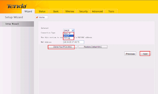 8. There are three internet connection type here--Static IP, DHCP and PPPOE,please choose the connection type correctly (if you don’t know which one to choose, please consult your internet service provider),then click on Clone Your PC’s MAC and hit Next.