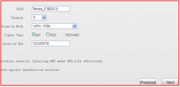 4. Then you will be in the following page, please do the settings as the picture, you can change SSID, it’s your wireless network’s name, Security Key is your wireless password; it should be at least 8 characters.