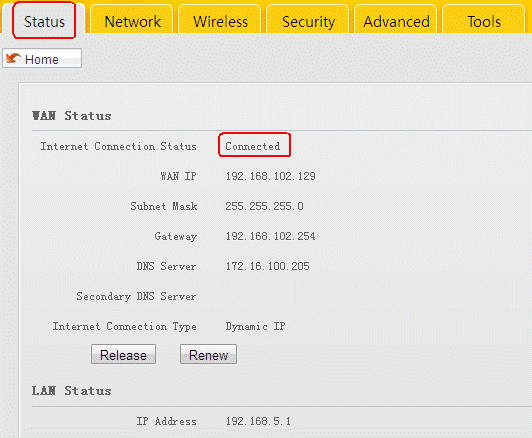 10.After rebooting, login to the setup page with the new LAN IP 192.168.5.1, and Click Status to check the internet connection status again, if it shows connected, you can go to internet, if not, please click on Renew and check whether the cable between A6 your modem is Connected firmly.