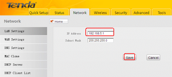9. Click Network to change the LAN IP into 192.168.5.1, then click Save.