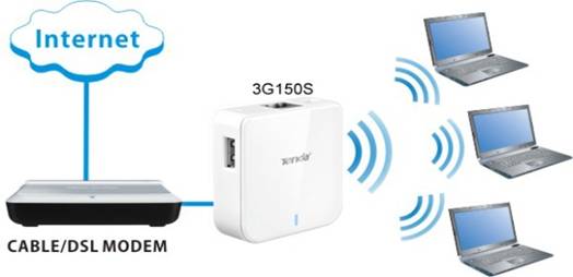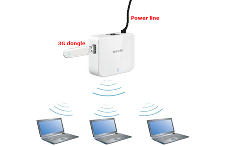 a) 3G Router mode (in the presence of a 3G dongle):clients can share Internet access either through a wireless or wired connection to the device. See connection diagram below.