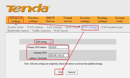 2,Please click Advanced SettingsàDNS Settings, The default DNS Settings is disabled. Please tick the DNS Settings to enable it, and type the primary DNS address and secondary DNS settings in the blank. Then click OK to save the settings (the primary DNS address and secondary DNS are provided by your ISP).