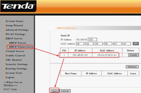 2.Click DHCP ServeràDHCP Client List on the left side of the homepage. Then please add the MAC address to the list and click Apply, then the computer with the MAC address will get the same IP address all the time.