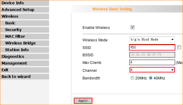 3. Click on Wireless, then set the same SSID and select the same Channel 6 as R1 in the Basic page, then click Apply.