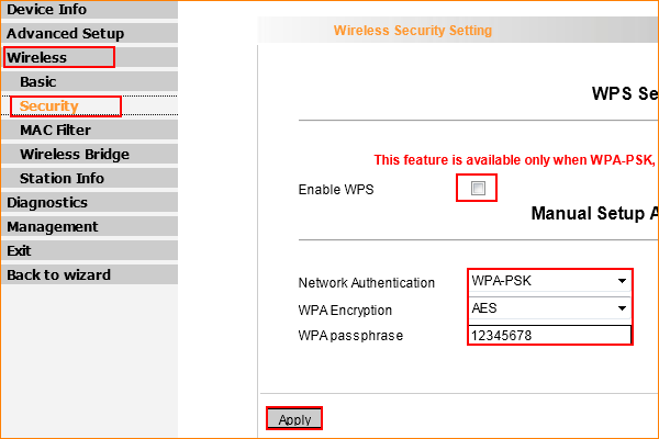 4. Click on Security, disable WPS and choose WPA-PSK as the Network Authentication and AES as the WPA Encryption, and set the passphrase the same as R1.