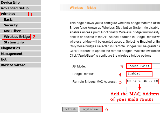 5. Click on Wireless Bridge, and add the MAC Address of R1.