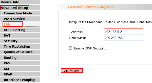 6. Click on Advanced Setup, and then click on LAN and then change the LAN IP into 192.168.0.2.