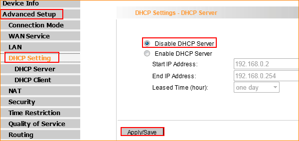7. Click on DHCP Settings, and then disable the DHCP Server.