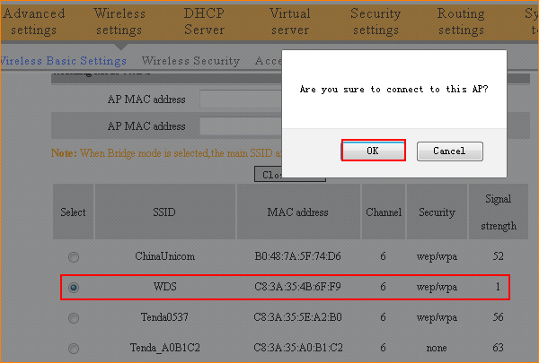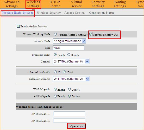 1. Click on Wireless Basic Settings, choose Network Bridge (WDS) as the wireless working mode, then click Open Scan to find the SSID of R2 and select it to add its MAC address, then click OK to save.