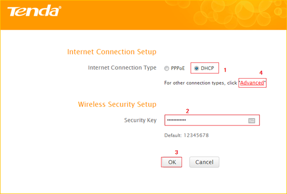 3 Choose the Dynamic IP option, then set a Security Key for the wireless security, then
