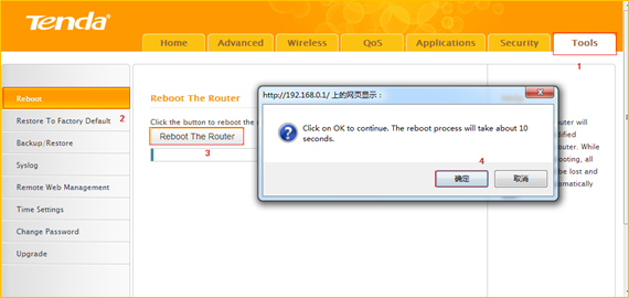 4 Click Tools, click Reboot, and then press the Reboot The Router button then click OK for