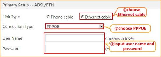 3.1.3 Setup D303 in home page, choose Ethernet cable, PPPoE and then please type in user name, password (you can consult your ISP for it if you don’t know) and OK.