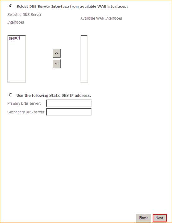 3.2.3 Click WAN Service and Add, keep the eth1/eth1 and click Next, then choose PPP over Ethernet (PPPoE) and click Next, please type in user name and password (you can consult your ISP for it if you don’t know).Click Next and click Apply/Save.