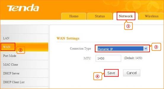 1.Click Network, then click WAN. Choose Dynamic IP, click Save.