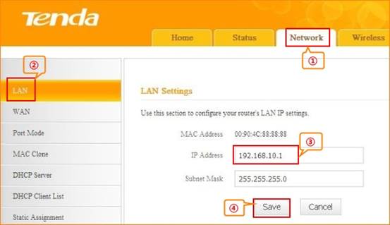 2. Click Network, and then click LAN. Change your router’s LAN IP.(The LAN IP address should be in different network segment. For example, the uplink router has the LAN IP 192.168.0.1, then you can set the secondary router’s LAN IP as 192.168.10.1.)